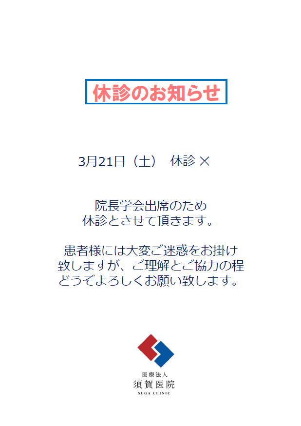誠に勝手ながら、2026年3月21日(土) は、学会参加のため休診とさせていただきます。